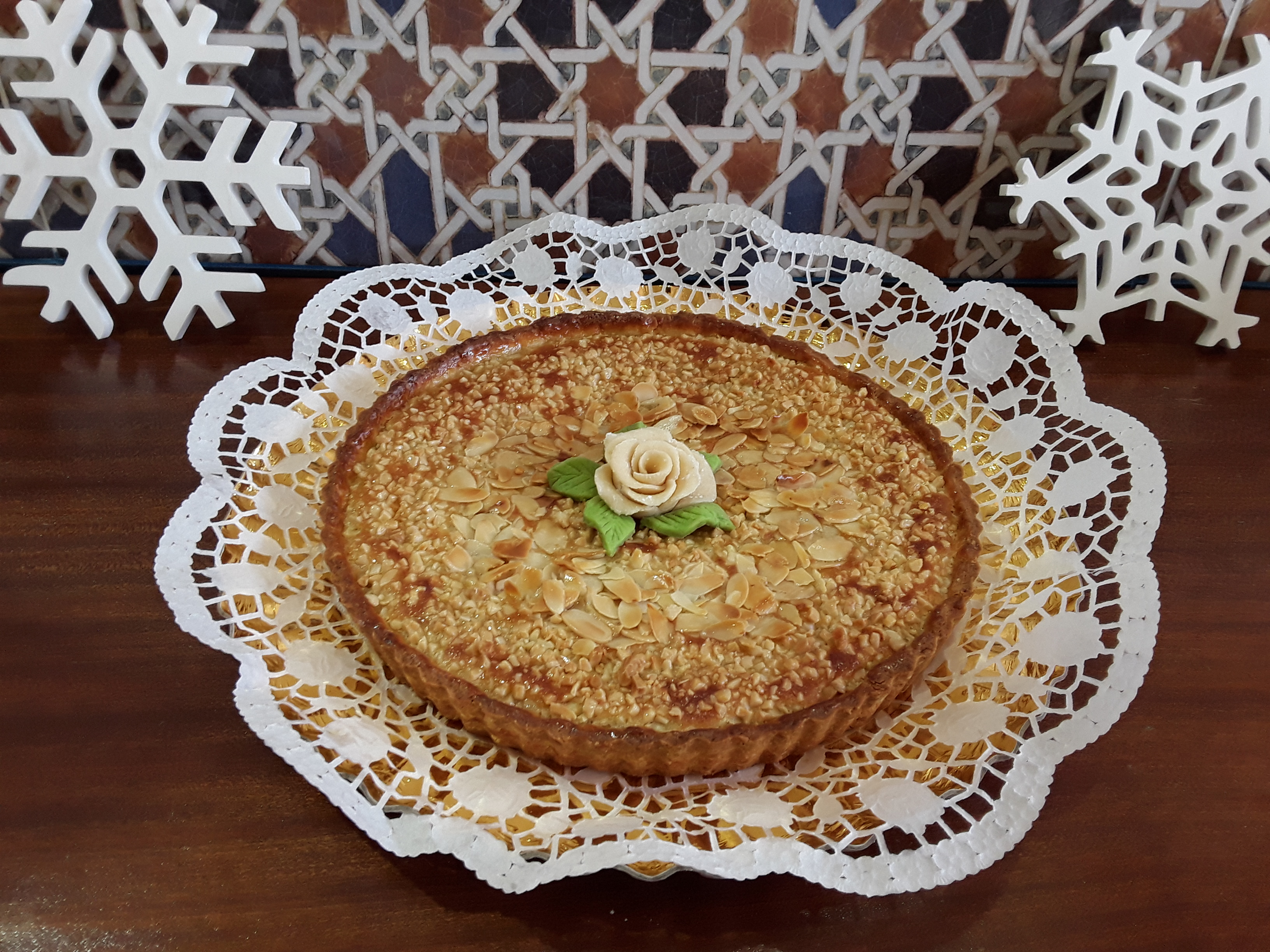 Un entremet composé d’une dacquoise aux amandes, d’un croustillant feuilletine-praliné, d’une mousse chocolat blanc